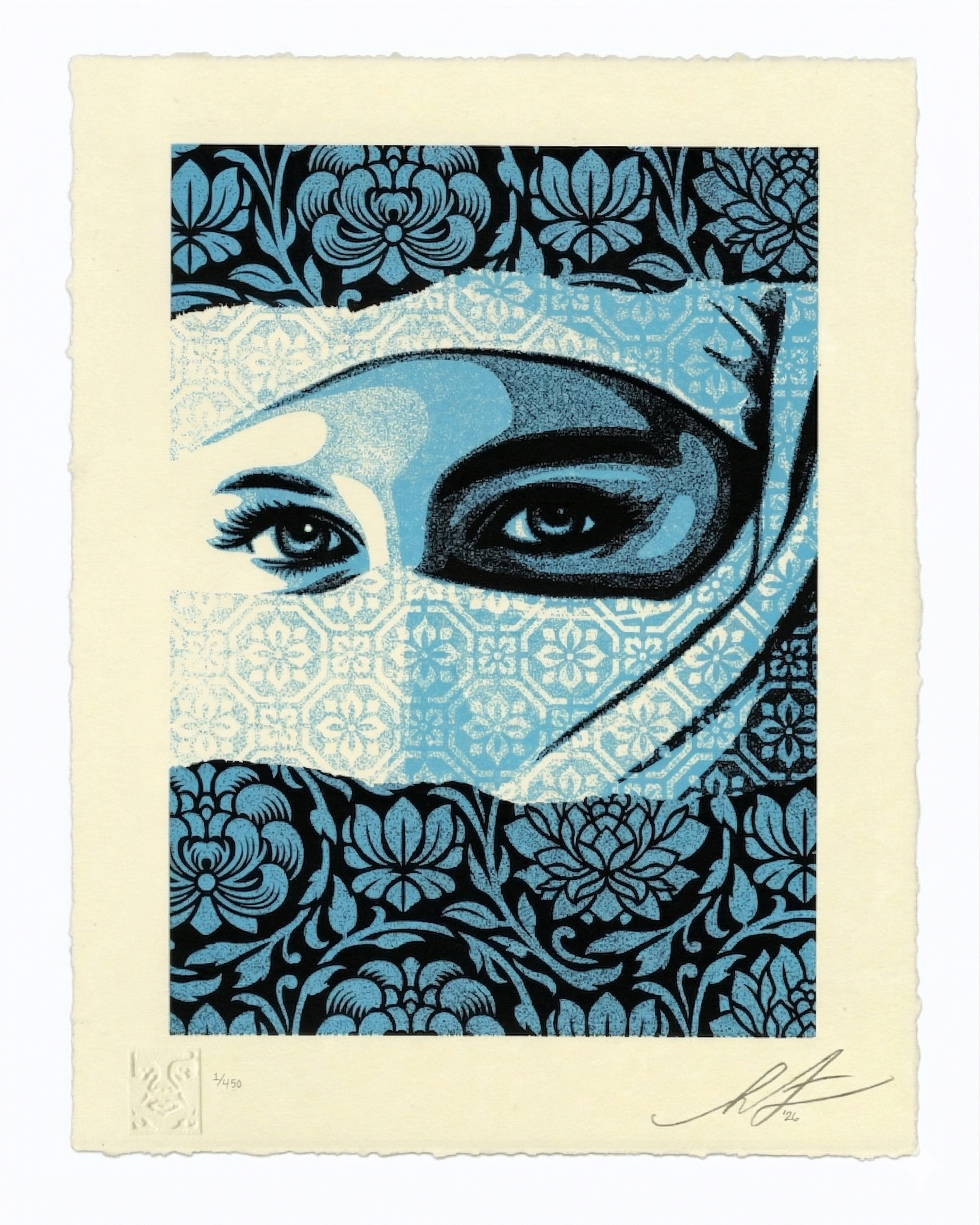 13" H x 10" W. Letterpress on cream cotton paper with hand-deckled edges. Signed by Shepard Fairey. Numbered edition of 450. Obey publishing chop in lower left corner. Comes with a Digital Certificate of Authenticity provided by Verisart. Max order: 1 per customer/household.